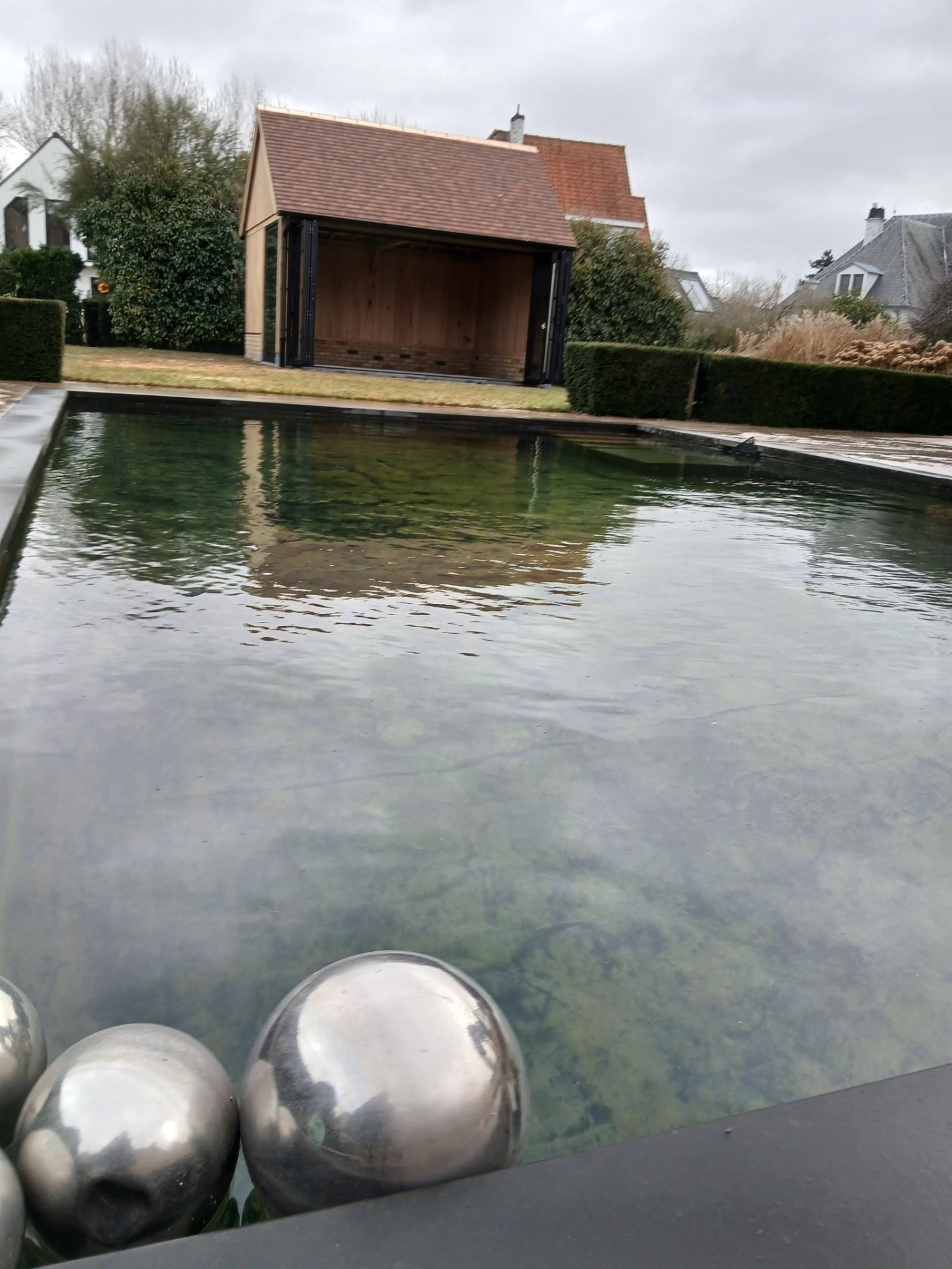 Eiken poolhouse met blauwsteen sokkels en plinten, Koramic tegelpannen Rustica en alu schrijnwerk STEELLOOK. Prachtig hoe alle zwarte details, zoals inbouwspots en kleine ramen tot hun recht komen