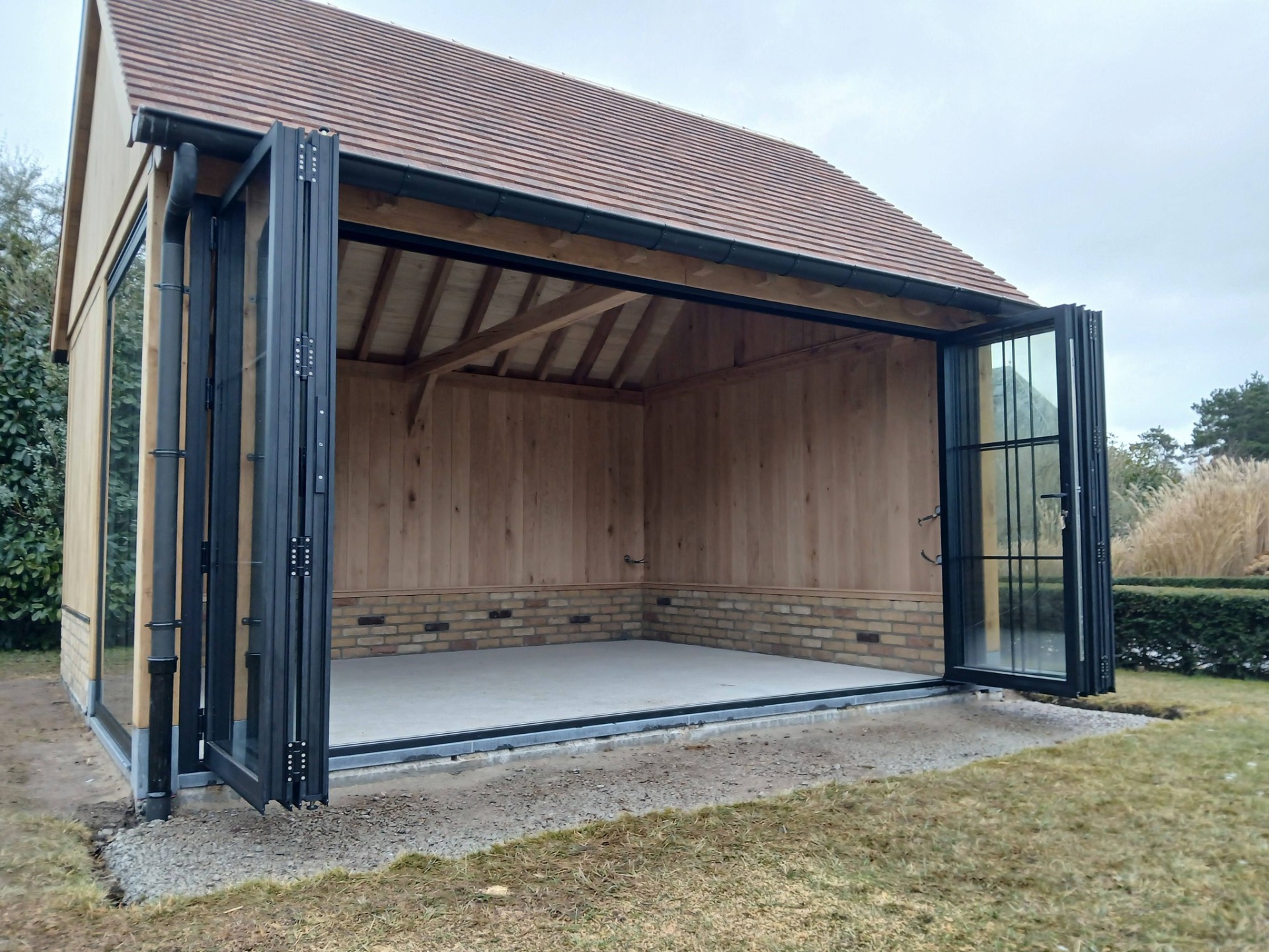 Eiken poolhouse met arduin sokkels, gemetselde haard en gekaleide schouw