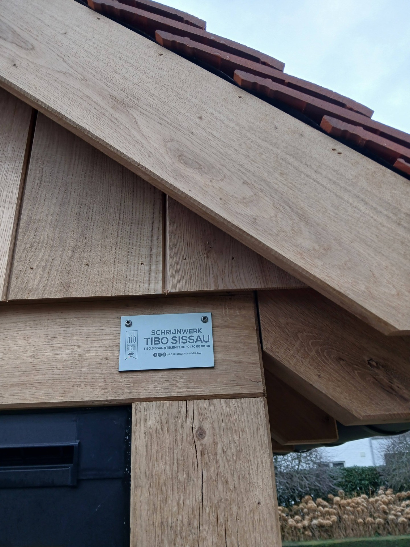 Eikenhouten reclamepaneel voor Floriste Leen Roelens uit Passendale, afgewerkt met tegelpannen Koramic 301 Natuurrood 600 en koperen nokstuk
