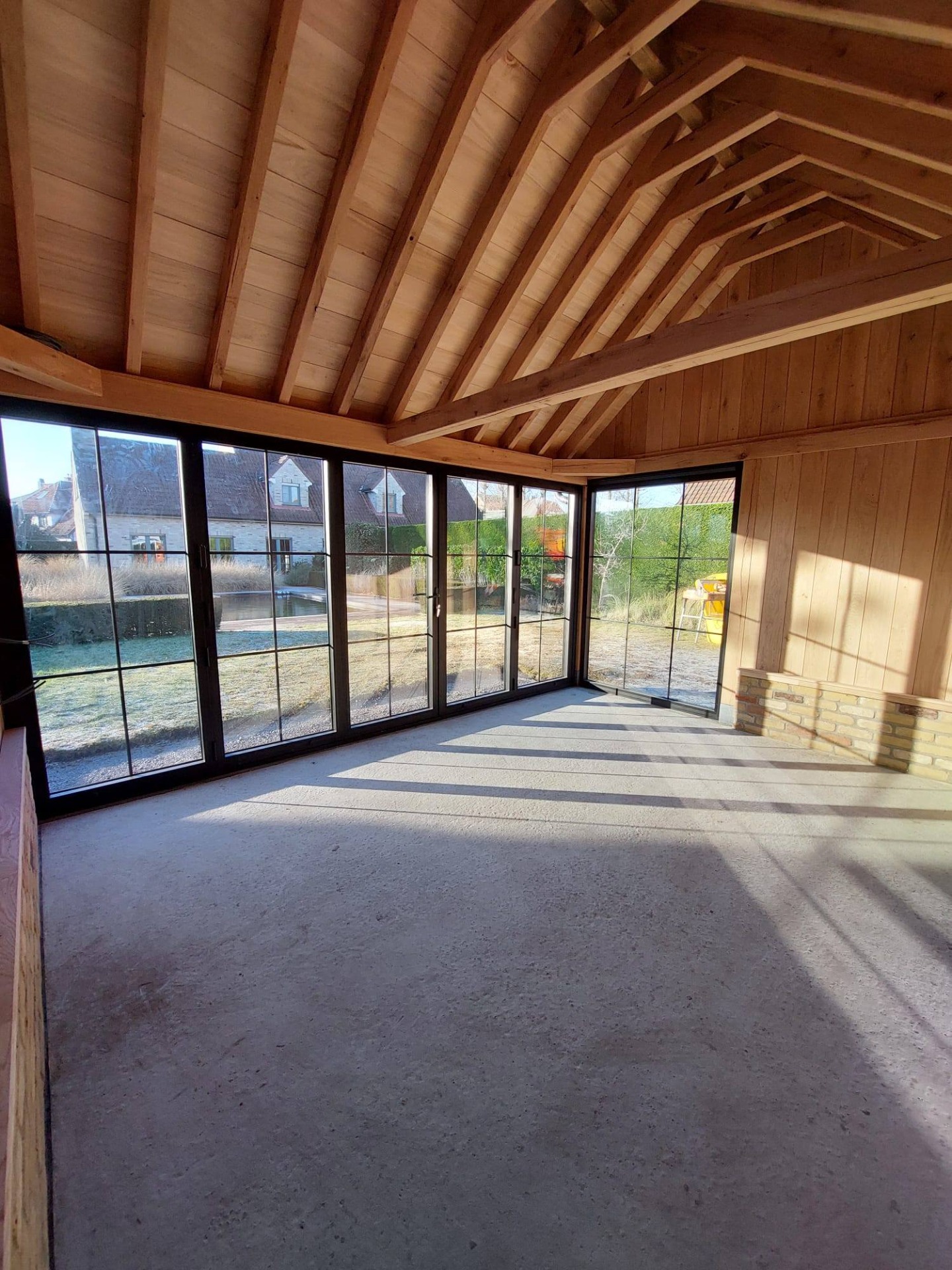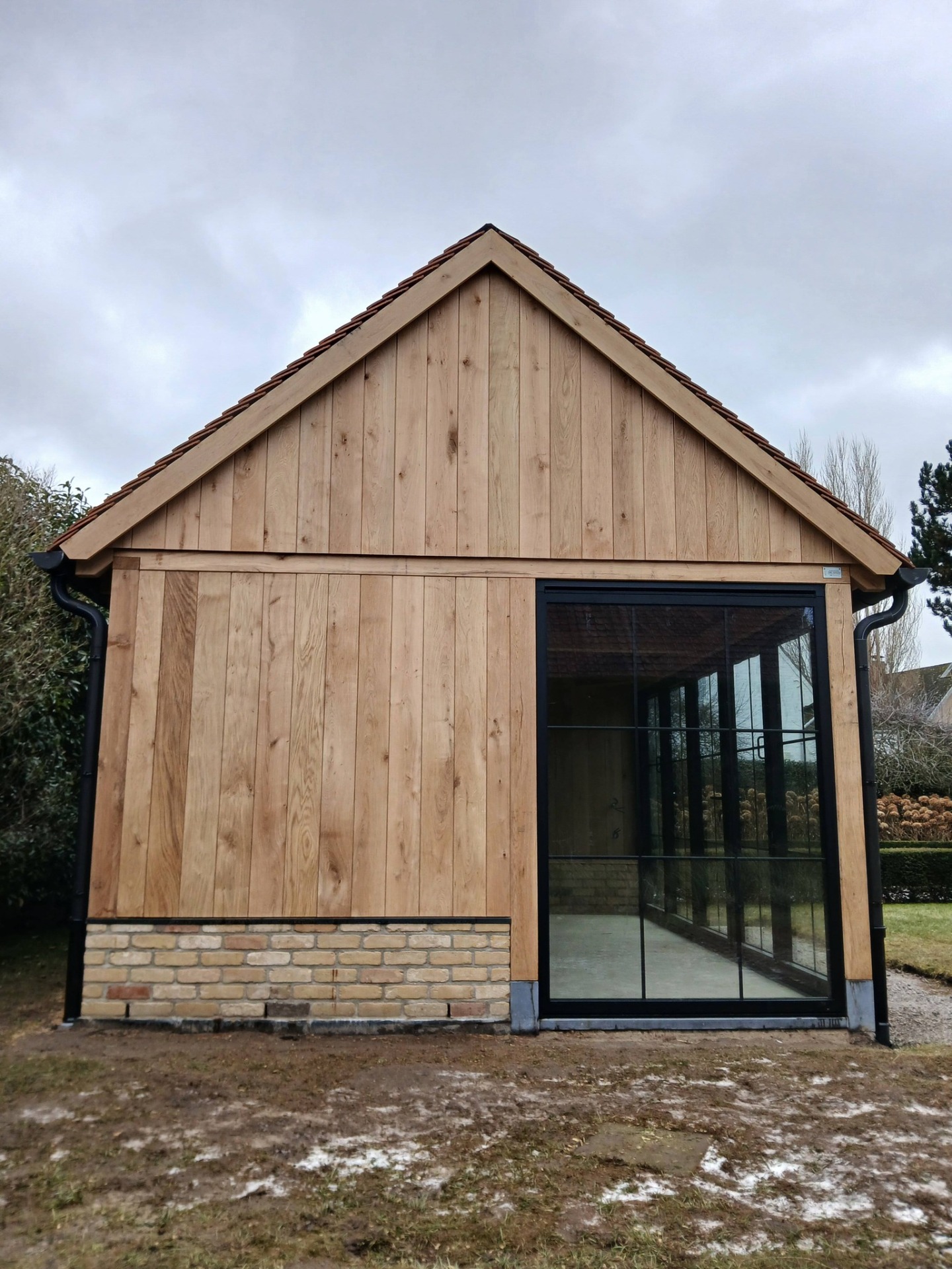 Eikenhouten aanbouw aan woning met stalen raamwerk