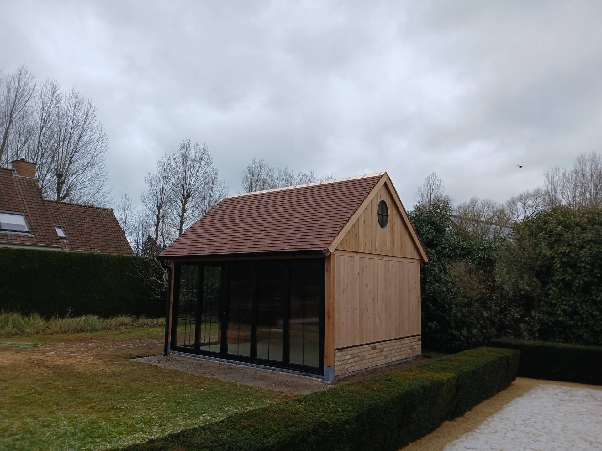 Eikenhouten bijgebouw in landelijke landschapstuin